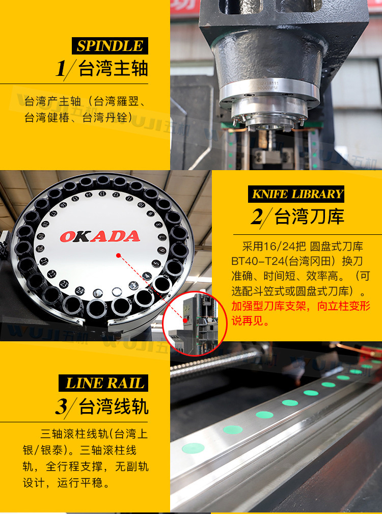 3.传动部件:三轴皆使用精密级丝杆,并予以适当的预压,尾端采用 J 预拉设计,配合高精密级低阻力线轨,确保高速、高精度加工要求。